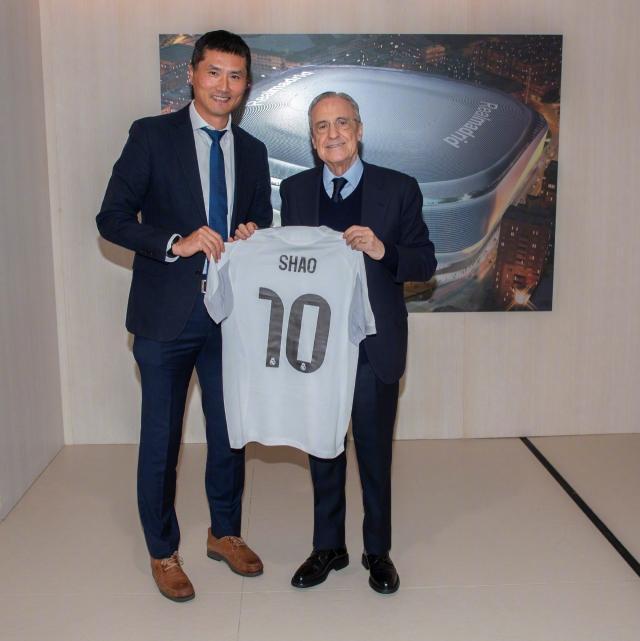 国足主帅邵佳一到访皇马,与弗洛伦蒂诺合影+获赠10号球衣
